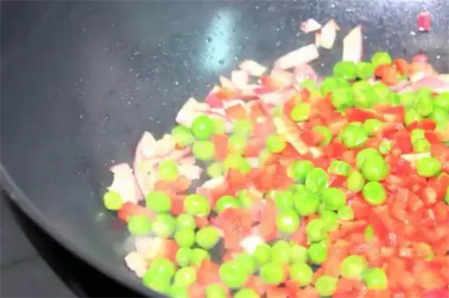 食材準備好之后呢,拿個小湯鍋加水把雞蛋煮熟備用!然后把洋蔥,甜椒都切碎,把里脊肉(瘦肉)剁成末。再起炒鍋,加油燒熱,然后把洋蔥碎放鍋里炒熟炒軟,洋蔥碎炒軟之后,加入甜椒碎和豌豆一起炒熟!