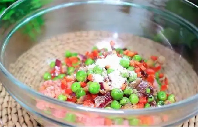 洋蔥,豌豆等配料炒熟之后跟肉末倒一起,加入1湯匙生抽,加入少許食鹽,加入少許黑胡椒粉,加入少許淀粉,然后用筷子把所有的食材攪拌均勻備用!
