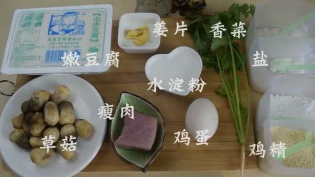 需要準備的材料有: 瘦肉 X 50g;草菇 X 少量;嫩豆腐 X 100克;雞蛋 X 1只;姜片 香菜 X 少量;水淀粉 鹽 雞精 胡椒粉 X 適量