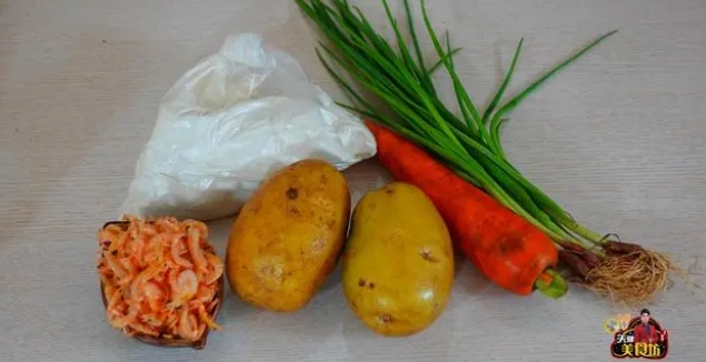 在開始正式制作之前呢,我們首先需要準備以下食材:土豆2個,面粉100克,蝦米15克,胡蘿卜1根,小蔥3根,食鹽1茶匙,胡椒粉1湯匙