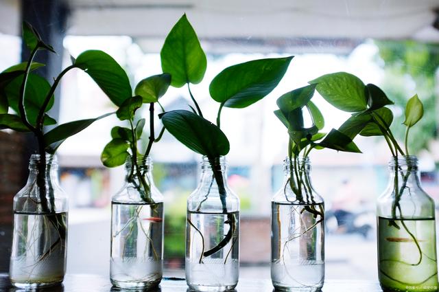 2?? 將綠蘿的根部清洗干凈,放入玻璃瓶中,讓綠蘿的根部浸泡在啤酒中。 3?? 每天早晚各噴一次清水,保持綠蘿的葉片清潔。
