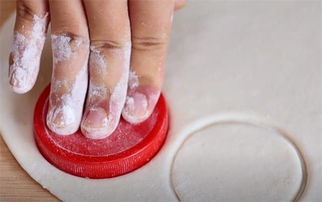 4.搟好之后拿一個(gè)瓶蓋,我們用它裁剪出形狀。