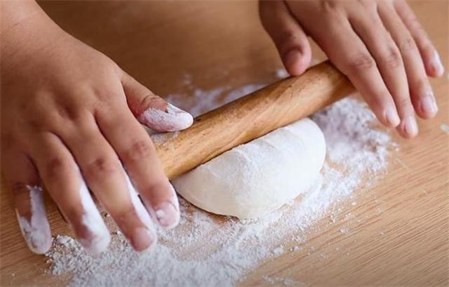 3.案板上撒些干面粉,我們先來(lái)處理白色面團(tuán),用搟面杖搟成餅皮。