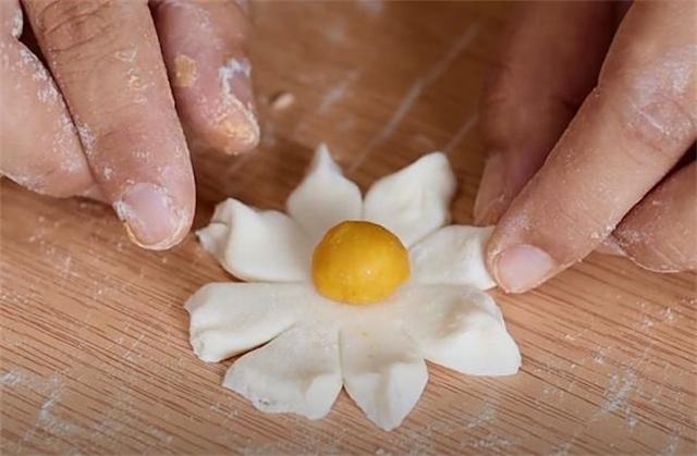 5.然后我們揪一小塊黃色面劑當(dāng)作花蕊部分,先在掌心團(tuán)圓,放在餅皮中間的位置,用刀把它分成八等份。