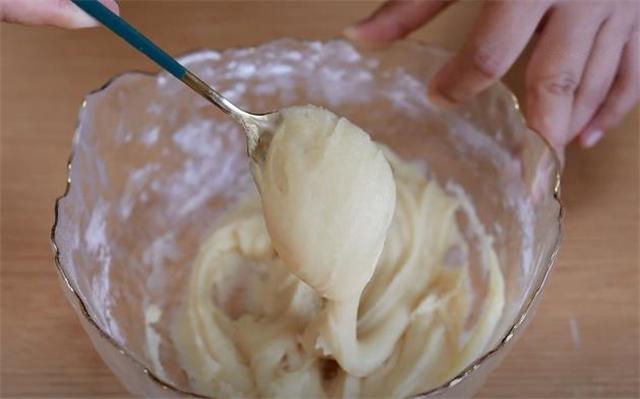 2.現在我們再來做油酥面,140g的低筋粉,和70g的食用油混合,最后混合好的狀態,就是這種濃稠的酸奶狀。