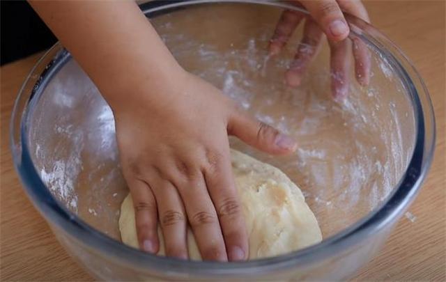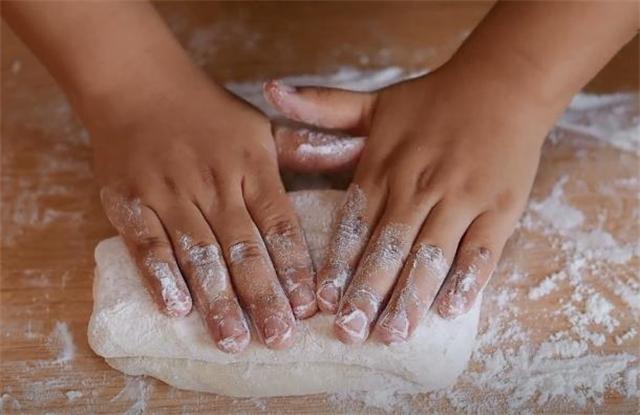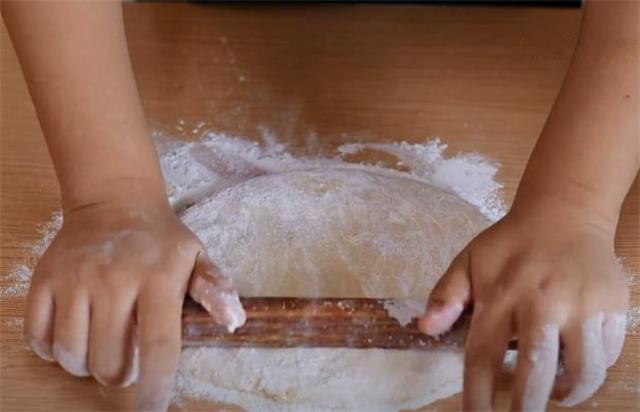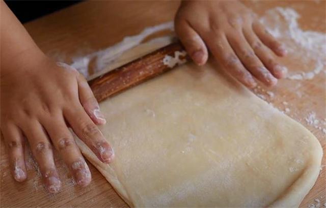 3.現在我們處理一下剛才和好的面團,案板上撒些干面粉防粘,用搟面杖搟開。