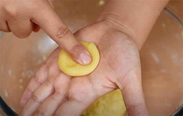 2.直接揪一小塊面劑出來,重量大概是13g,搓圓之后直接按扁,然后我們用這個(gè)食指,在中間按一個(gè)心形的形狀。