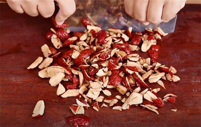 2.時間差不多到了,現在我們來處理一下紅棗,把紅棗去核切碎。