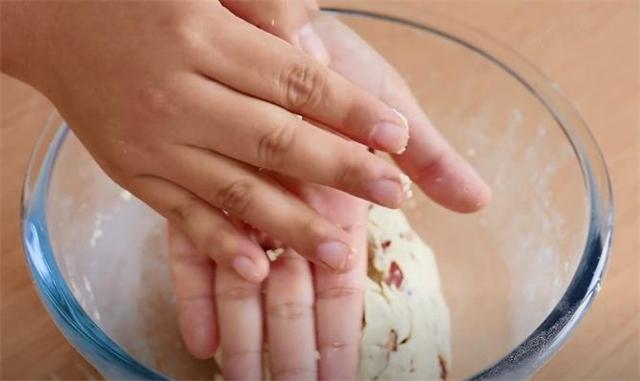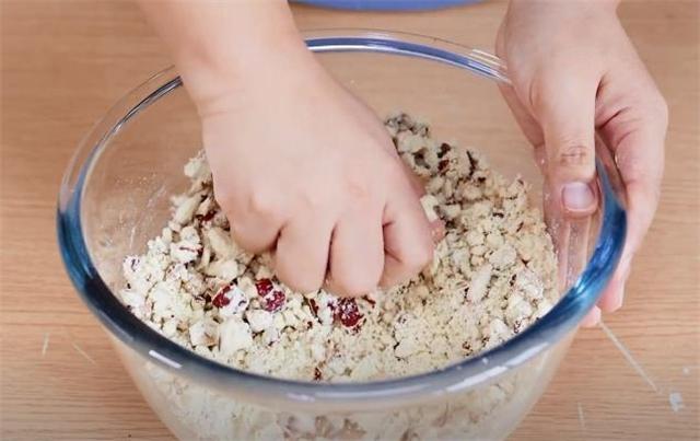 3.這時候再準備一些大黃米面,把切好的紅棗碎放進去,和面的時候我們只用清水就可以了,少量多次的添加,攪拌到顆粒的狀態就可以下手揉面了,這個面團要和的稍微硬一點。