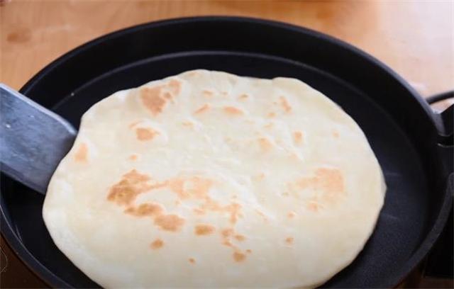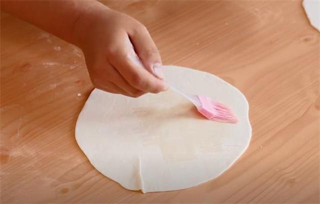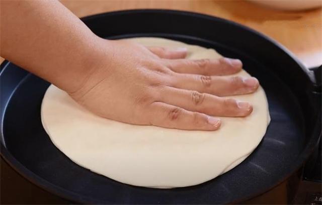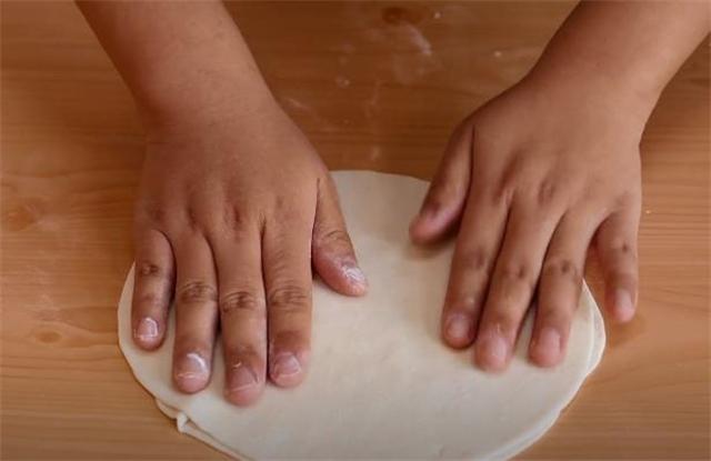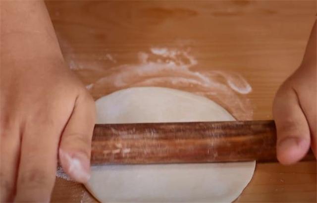 3.我們處理小面劑的時候,直接撒一些干粉防粘,這次搟的餅皮不需要太薄,稍微厚一點。