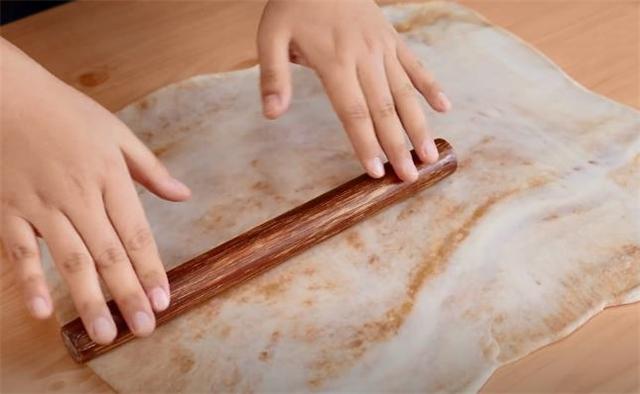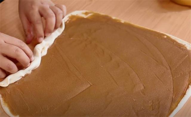 4.搟好之后我們倒上芝麻醬,全部鋪平之后我們從底部開始卷起來。