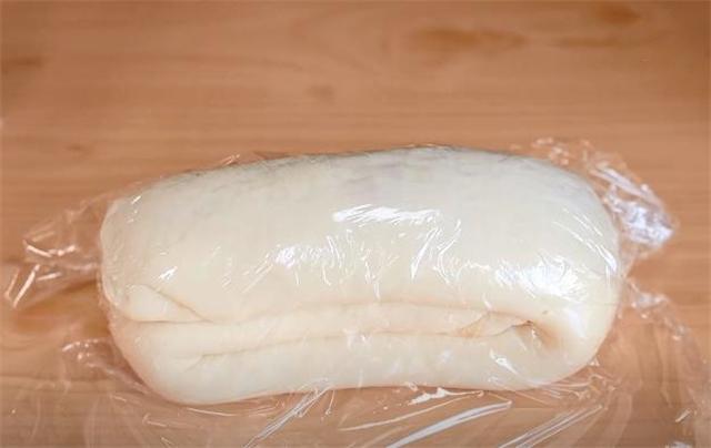6.收口的地方一定要捏緊,不然搟的時候就會特別容易露餡,我們把兩端的部分稍微往里對折,封上保鮮膜密封餳上10分鐘。