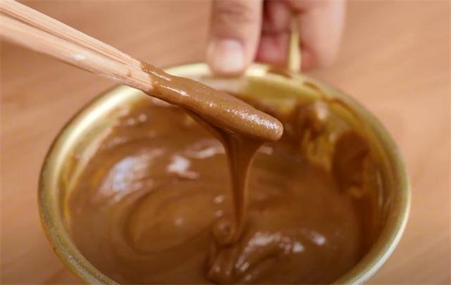2.這時候來調餡,芝麻醬里面加上香油,簡單的卸開之后我們加食鹽調味,再放一點點面粉,完全的攪開到勻稱的狀態,我們這個餡料就調好了。