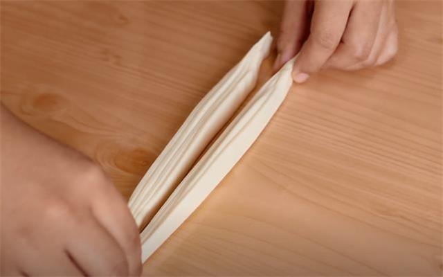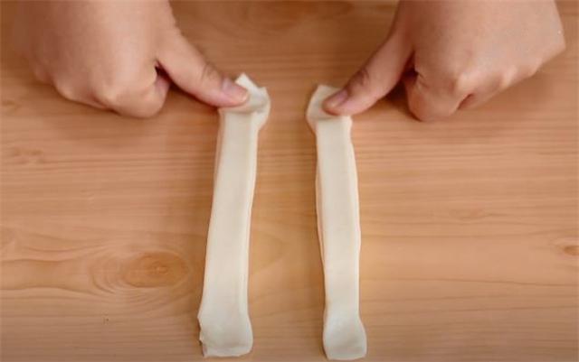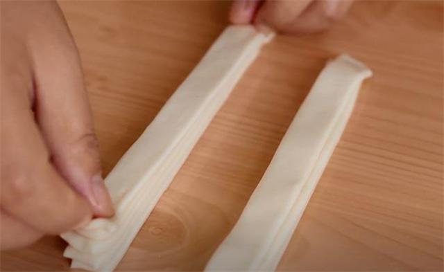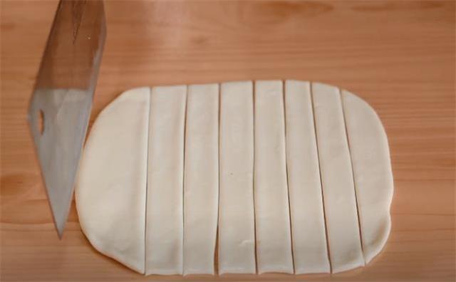 4.表面稍微的抹一點油用來防粘,再用刀切成長條。