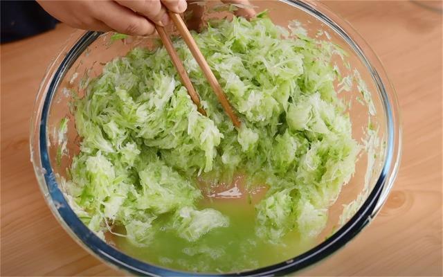 2.蘿卜絲擦好之后放上一大勺的食鹽,充分的攪勻之后我們腌上15分鐘。
