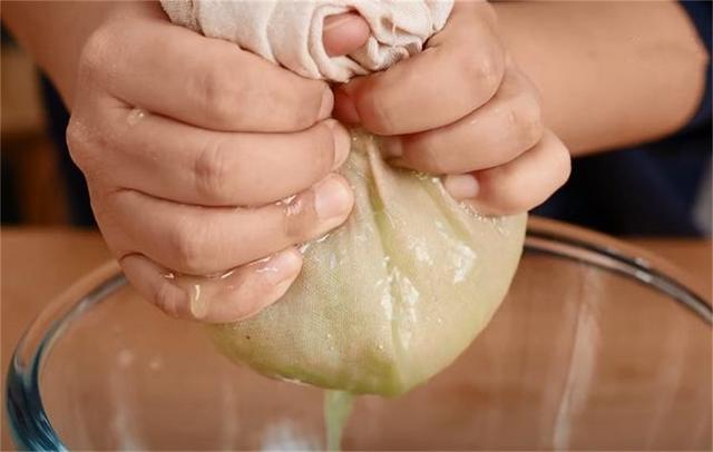 4.把蘿卜絲倒進紗布里面,盡量擠干水分。