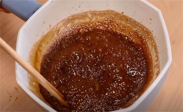 8.這時候我們再來熬糖漿,鍋中放適量紅糖和清水,把糖漿一直熬到特別粘稠,而且不斷的冒小泡的程度就可以了。