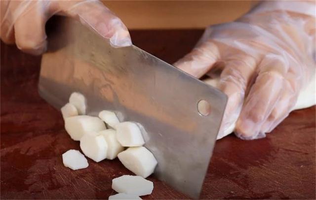 1.處理山藥之前我們最好戴上一個手套,這樣防過敏,然后把山藥削皮,切成小塊。