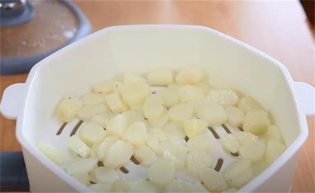2.山藥切好之后直接放在蒸屜里,蒸熟取出。