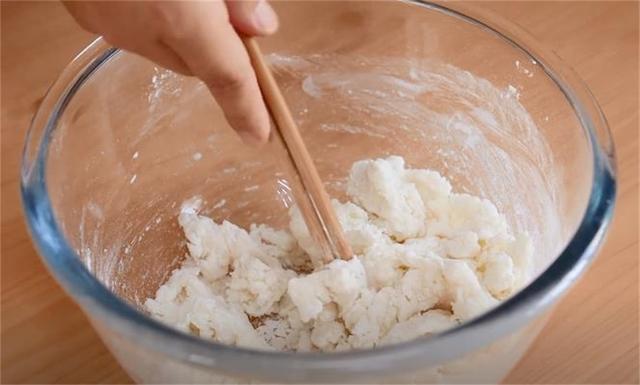 3.趁熱的時候加上白糖,把山藥搗成泥之后,我們少量多次的加牛奶,攪拌均勻再添加糯米粉,看到有這種大顆粒的狀態出現,我們就可以揉面了。