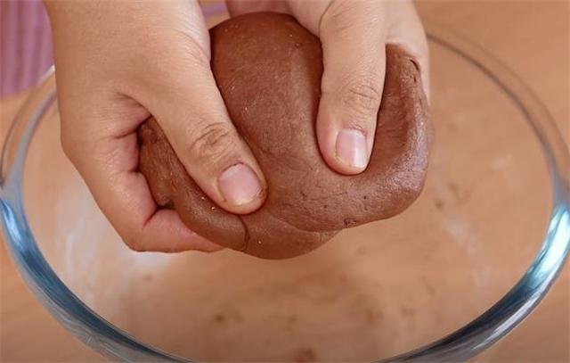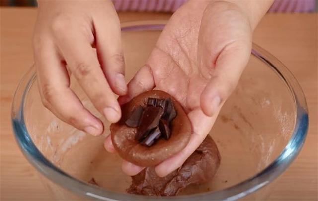2.做這個餅干不需要過多的揉面,我們用虎口處掐出來一個小面劑,里面包上一些巧克力餡,這樣可以形成一個爆漿的感覺。