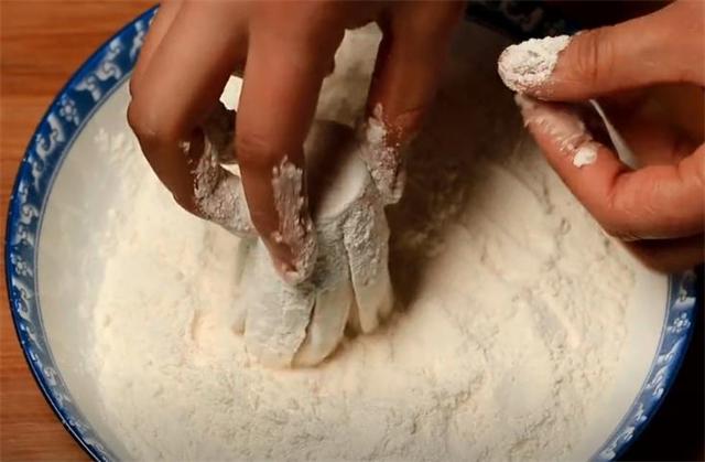 5.水分擠干凈后再裹上一層面粉,要讓各個部分都均勻地裹上。