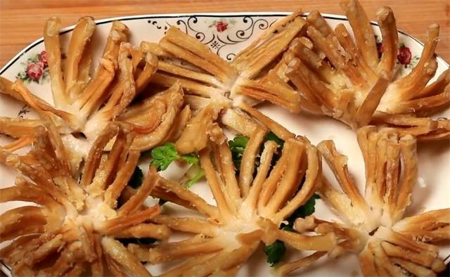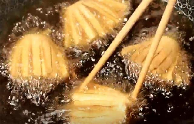 6.油溫六成熱下鍋炸,炸的時候花頭朝下,炸至定型后再翻面炸,炸至金黃熟透后控油撈出。