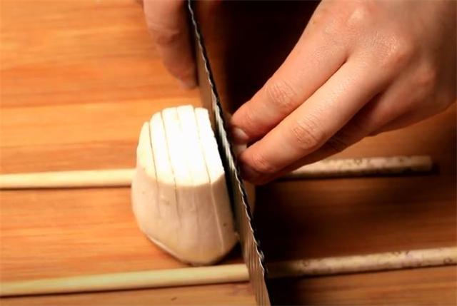 2.切成約5厘米的小段,一雙筷子放兩邊,就這樣一刀一刀地切,不要切斷。