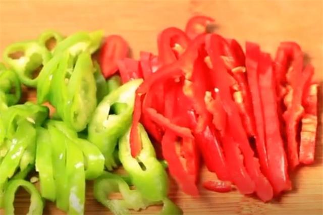 3.切一個(gè)青椒和一個(gè)紅椒。
