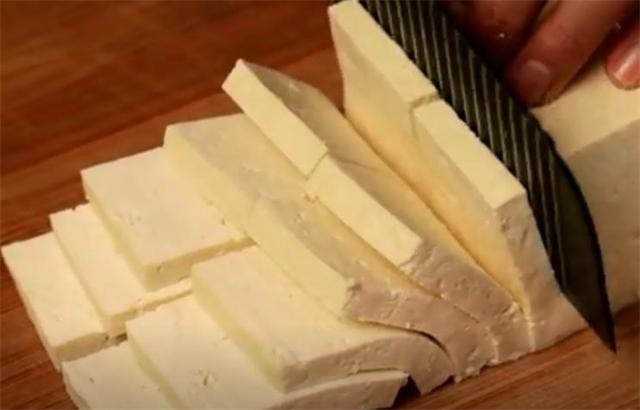 1.準(zhǔn)備一塊老豆腐,先把豆腐從中間切開,再切成厚度約0.5厘米的薄塊。