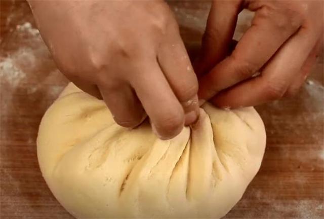 4.把醒好的面團再揉一下排排氣,面團揉成厚圓餅狀,小圓形面團放上面,像包包子一樣給它包起來。
