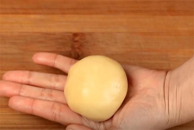 3.準備半碗面粉加入3勺熟拌勻,放到案板上揉下再團成圓形。