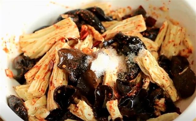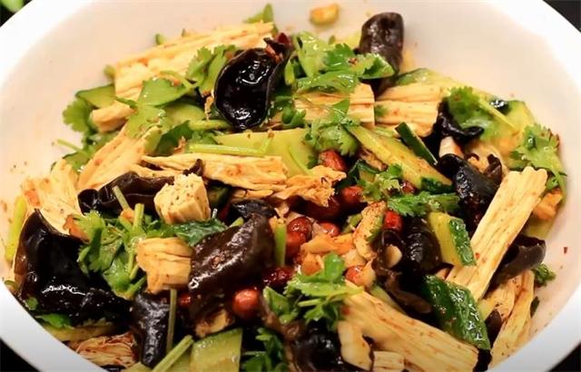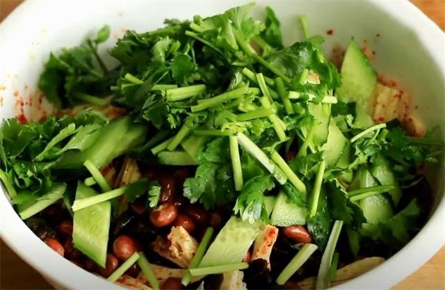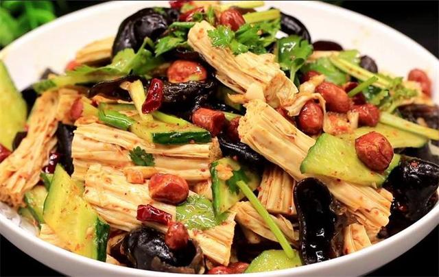 準備食材: 木耳、腐竹、蒜末、干辣椒段、辣椒面、食用油、鹽、白糖、味精、生抽、陳醋、花生米、黃瓜、香菜 具體做法: