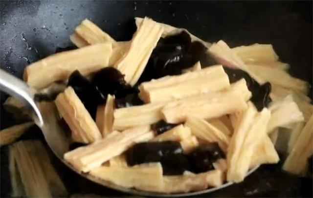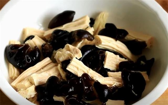 1.鍋里水開后下入泡發好的木耳,再下入泡好的腐竹。
