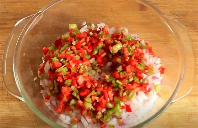 2.青椒和紅椒切碎,和洋蔥丁放在一起。