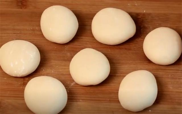 2.醒好后揉下排排氣,揉成長條后均分成8個小劑子,把小劑子揉成扁圓形。