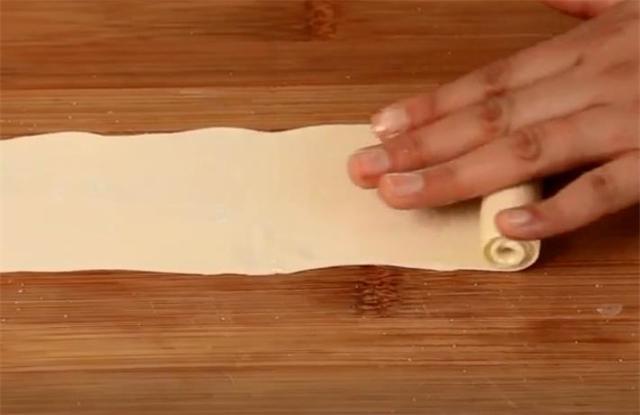 3.取一個小劑子揉成細(xì)長條,然后按扁,用搟面杖搟薄,上面刷一層食用油,再撒少許的食鹽,從頭到尾這樣卷起來。