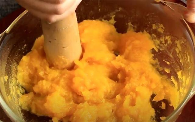2.南瓜蒸熟后加點白糖,搗碎成泥。