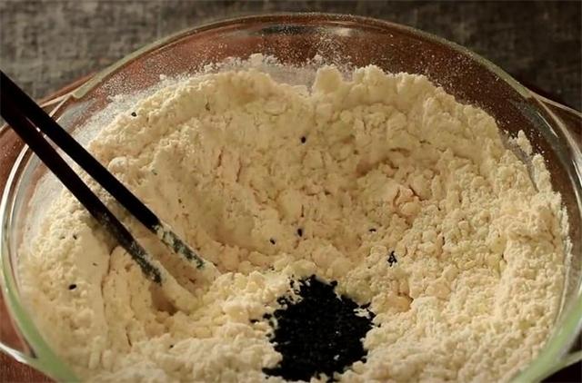 準(zhǔn)備食材: 普通面粉、泡打粉、白糖、黑芝麻、純牛奶 具體做法:
