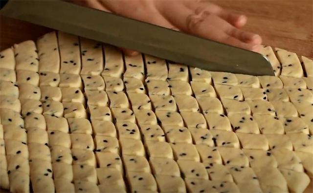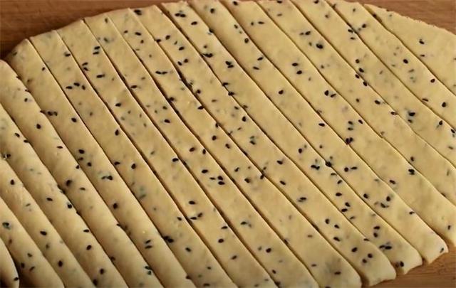 3.用搟面杖搟薄,先一個(gè)方向切條狀。