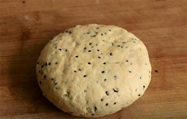 1.400g面粉里加6g泡打粉,再加80g白糖,再加點(diǎn)黑芝麻攪拌均勻。