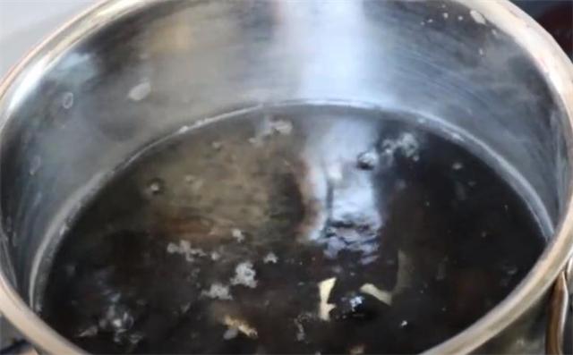 6.這會兒木耳泡好了,再將木耳沖洗干凈,然后把木耳倒入開水鍋里焯水,煮大約2分鐘就可以,木耳煮好后再過涼水控干水分備用。