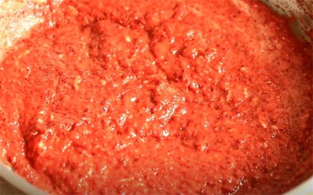 7.鍋里加300g辣椒面,倒入放涼的糯米糊,打好的泥也倒進去,加半勺白砂糖,戴上一次性手套給它完全攪勻。