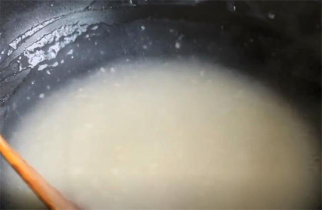 4.鍋里300g的水加入100g的糯米粉,攪勻到沒有干糯米粉后開小火,煮成這種粘稠度后放涼備用。