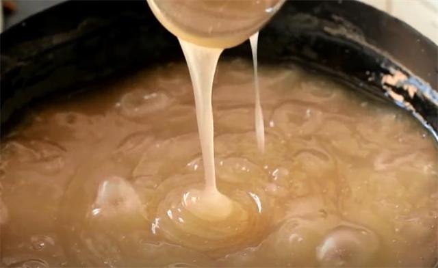 3.加半勺食用堿和一勺食鹽,然后開火煮,煮的時候要不停地攪拌,煮至粘稠的時候改成小火煮,煮到鍋里起大泡就熟了。