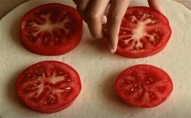 3.案板上撒些干面粉,面團醒好后揉下排氣,然后分成兩份搟薄,放上西紅柿。