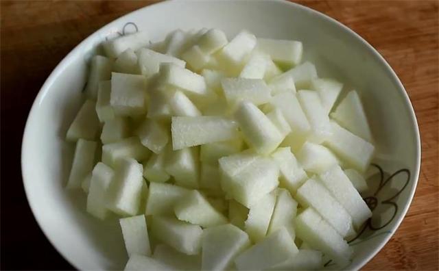 1.我們先切一塊冬瓜,把冬瓜皮去掉,再切成小塊。