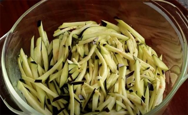 1.先把茄子去蒂后切絲,然后清洗干凈。