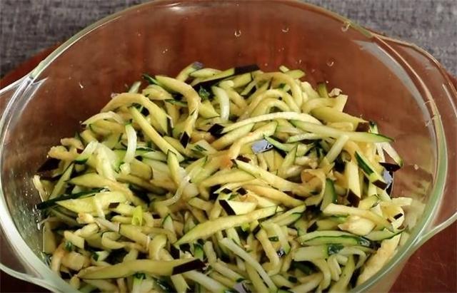 2.黃瓜也切絲,再切點蔥花,和茄子放在一起,加適量食鹽和十三香,用手抓勻后腌制十分鐘。