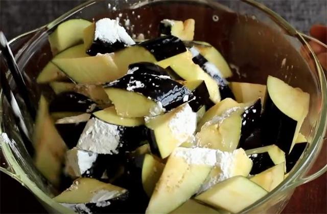 2.然后再讓茄子均勻地裹上一層淀粉,這樣炸出來的茄子不會油膩。